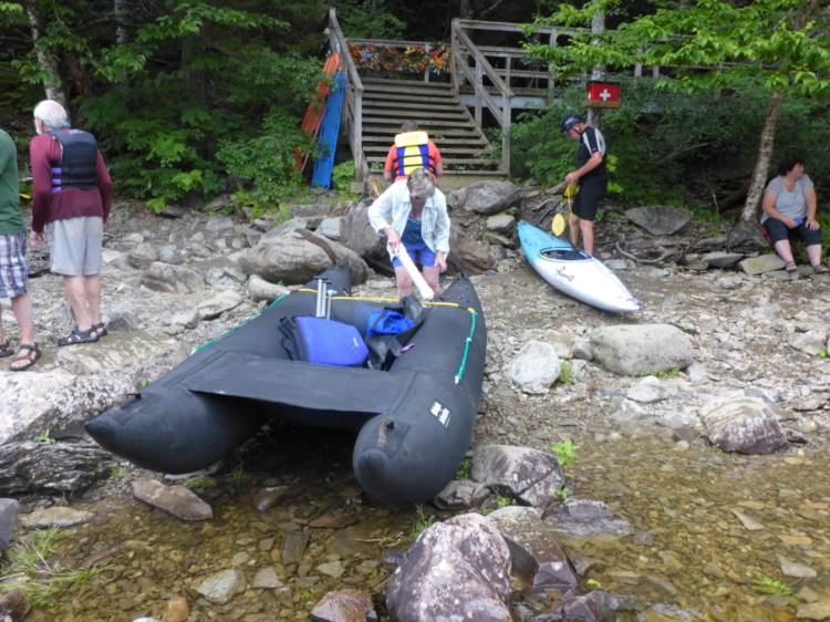 We left a shuttle vehicle in West Forks and a kayaker joined Nancy and me for the drive to Carry Brook. The Carry Brook excursion begins with a steep carry down a long twisting staircase to the river. On a typical summer weekend, the Kennebec River between Harris Dam and West Forks is a bustling place. Kayakers, canoeists, inflatable boaters and rafters were climbing and descending the busy stairway when we toted our boats down. The rafting release had arrived by the time we reached the river, and the fish flow contingent was anxiously waiting to paddle.