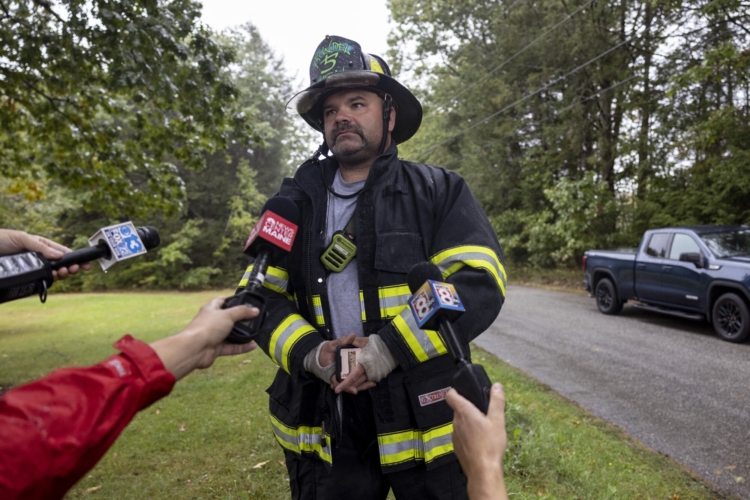 Arundel Fire Captain Nathan Howe speaks to members of the media on Sam’s Road in Arundel near the site of a plane crash in the woods on Wednesday. Brianna Soukup/Staff Photographer