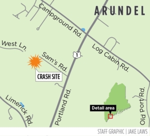 When firefighters from Arundel, Biddeford and Kennebunk arrived at the crash site, the plane was burning. It crashed in a wooded area off Sam’s Road, near Route 1 in Arundel. Arundel Fire Capt. Nathan Howe said no one was transported to a hospital following the crash.