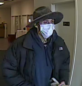 In a photograph released by police, the suspect is wearing a brown hat, a light-colored protective mask, a dark jacket and dark athletic pants, possibly with a light stripe.