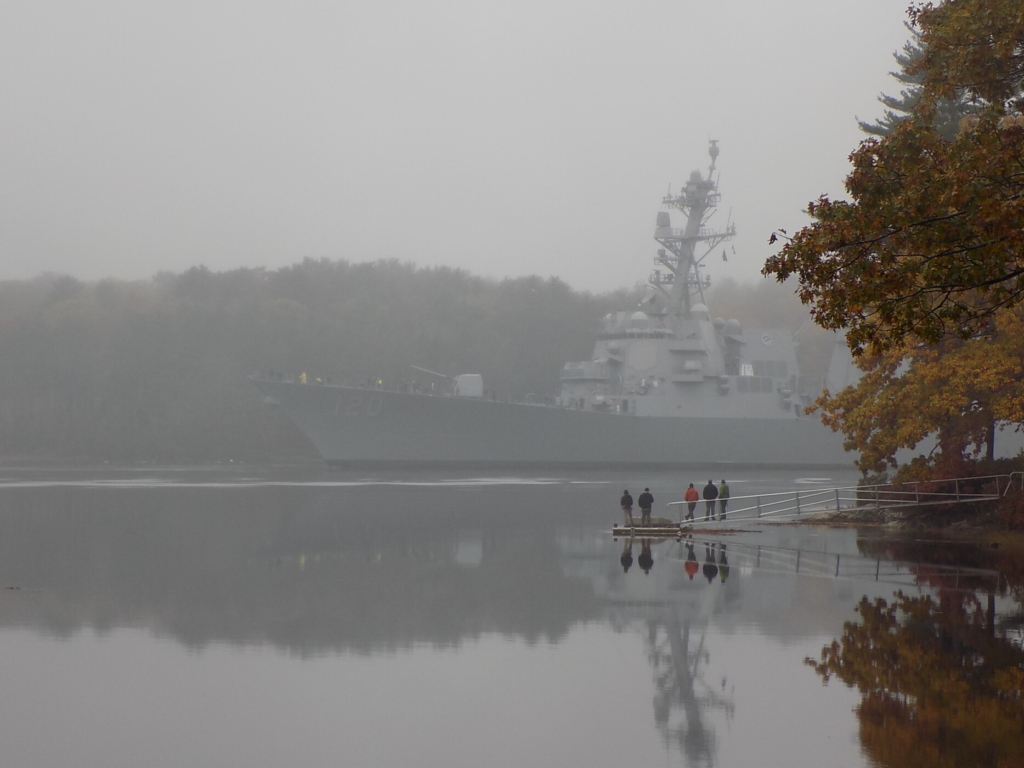 The future USS Carl Levin slides past Doubling Point, Arrowsic, around 11:30 a.m. Monday, Oct. 24, on its way down the Kennebec River for sea trials. Paul Kalkstein photo