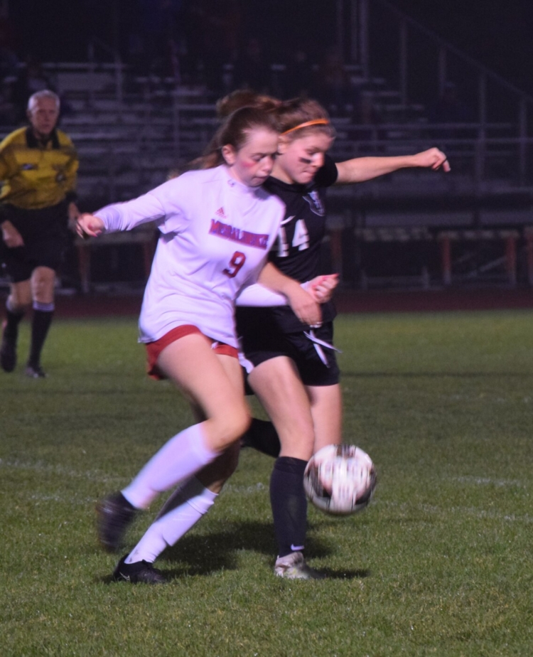 Messalonskee’s Rylee McKay (9) and Brunswick’s Eva Kousky (44) both go for the ball during the first half of a Class A North quarterfinal game Tuesday night in Brunswick. The Dragons won 5-1. Eric Maxim/The Times Record