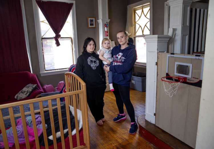 Amanda Graham, right, is shown with her daughters, Akira Dunlop, 1, and Sephia, 13, in the living room of their home in Rumford on Saturday. The family has been struggling to figure out how to heat their home and haven’t been able to afford filling the oil tank. They recently received a donation of 100 gallons of heating oil through a local organization affiliated with the Praise Assembly of God church in Rumford. Derek Davis/Staff Photographer