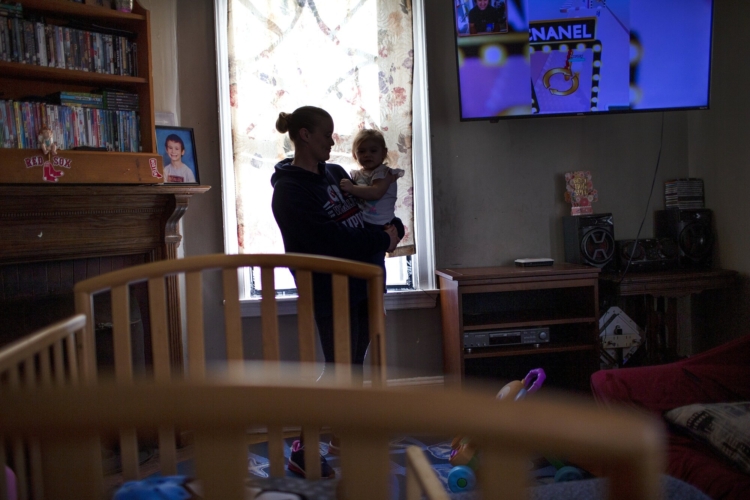 Amanda Graham holds her 1-year-old daughter, Akira Dunlop, at their home in Rumford on Saturday. Graham, 34, is out of work and cannot afford to buy oil. She has applied for LIHEAP federal assistance, but that program is in high demand. “What am I going to do?” she wonders. Derek Davis/Staff Photographer