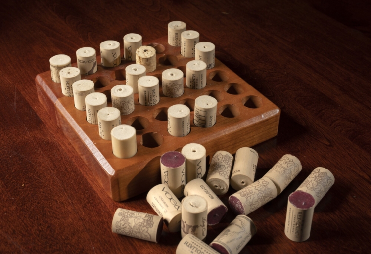 A cork peg solitaire game made from a square block of wood, photographed at Christine Burns Rudalevidge’s house. Gregory Rec/Staff Photographer