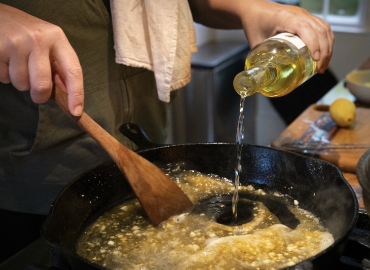 After you add the wine to the sautéing garlic, and reduce the liquid, you’ll add the mushrooms and pasta to make White Wine and Mushroom Pasta. Gregory Rec/Staff Photographer
