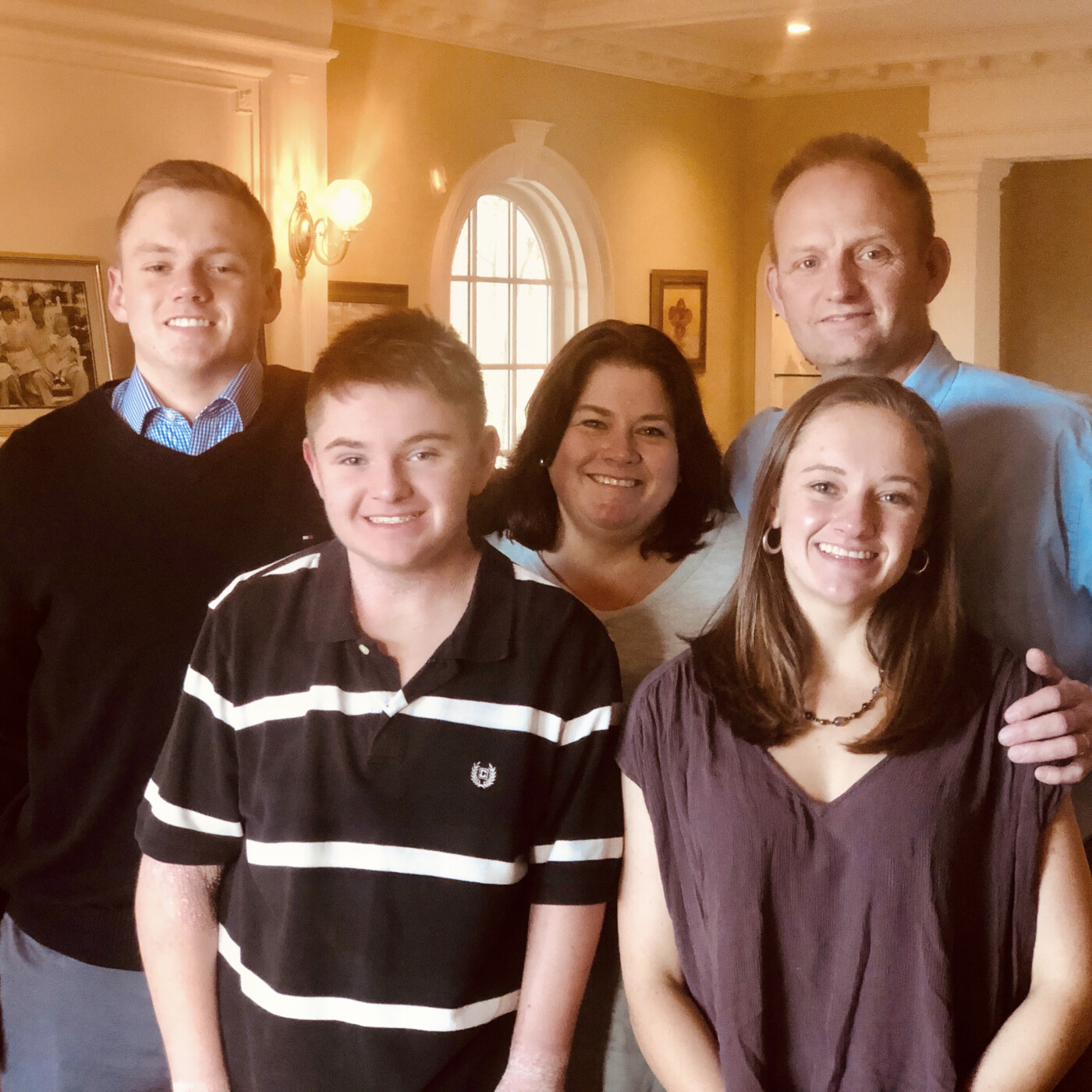 Evan Mayone, front left, with his family on Thanksgiving Day 2019, including his sister, Sophia, at right, and his brother, Harrison, mother, Kimberly, and father, Mark, standing behind him. Photo courtesy of Kimberly Mayone