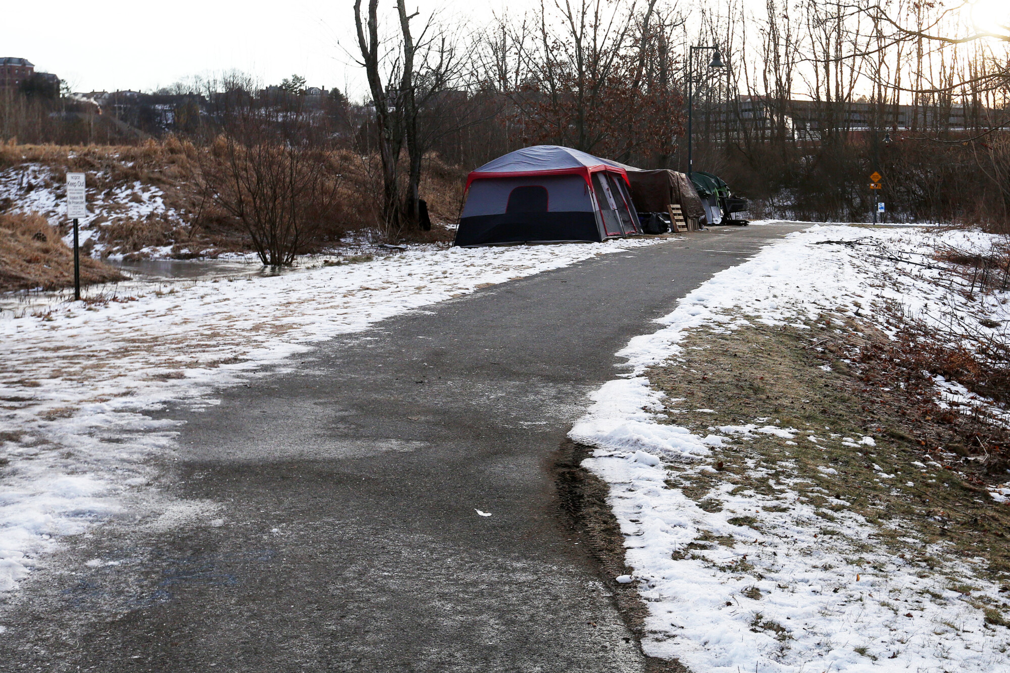 The site of a suspicious death at a homeless encampment along the Fore River Parkway Trail System in Portland. Ben McCanna/Staff Photographer
