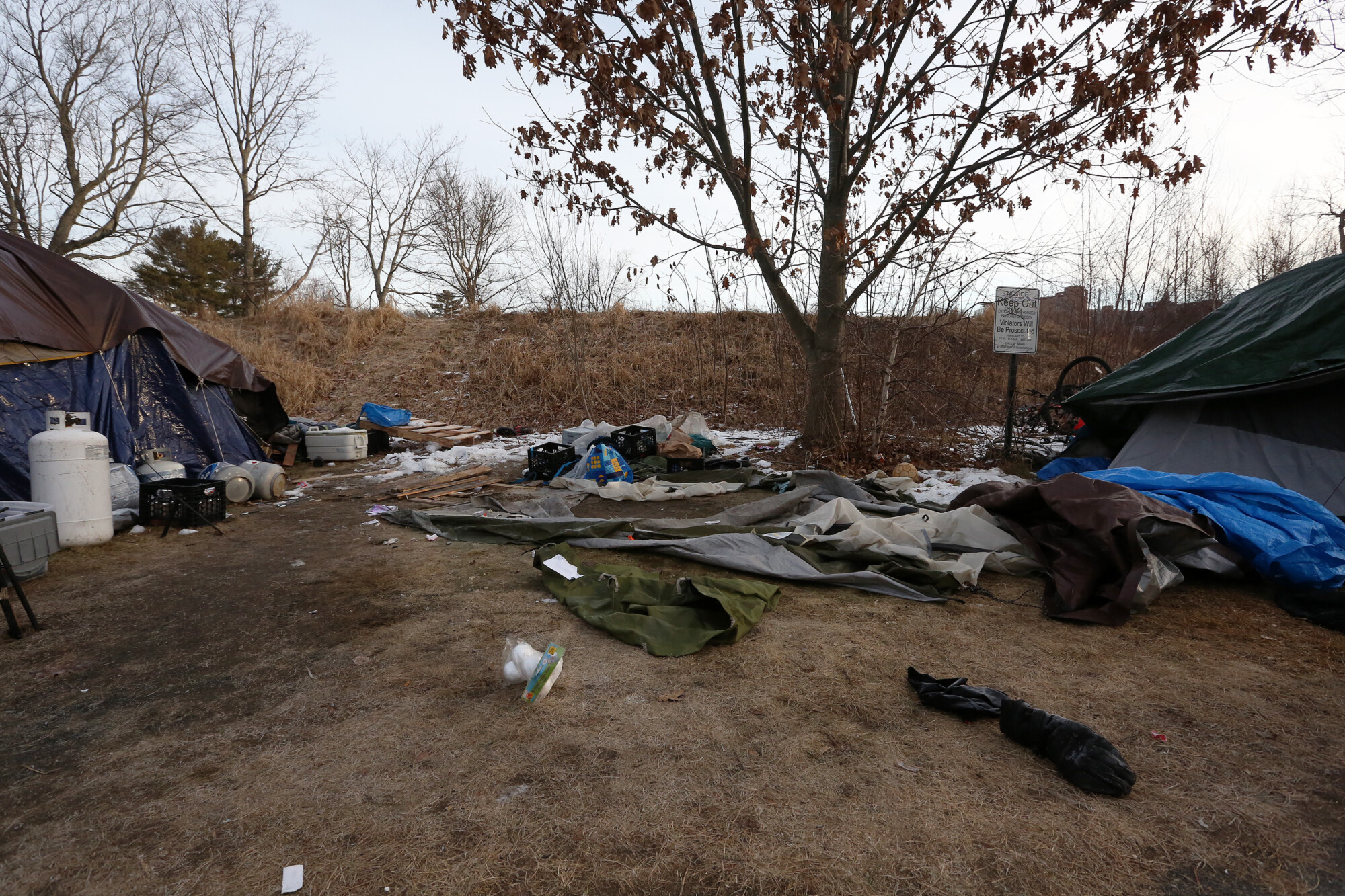 “I was woken up by the sound and that’s pretty much it,” the man said. He said part of the tent where the man had been staying had been removed by police following his death. People in the tents on either side of where the tent had been didn’t want to speak to a reporter Thursday.