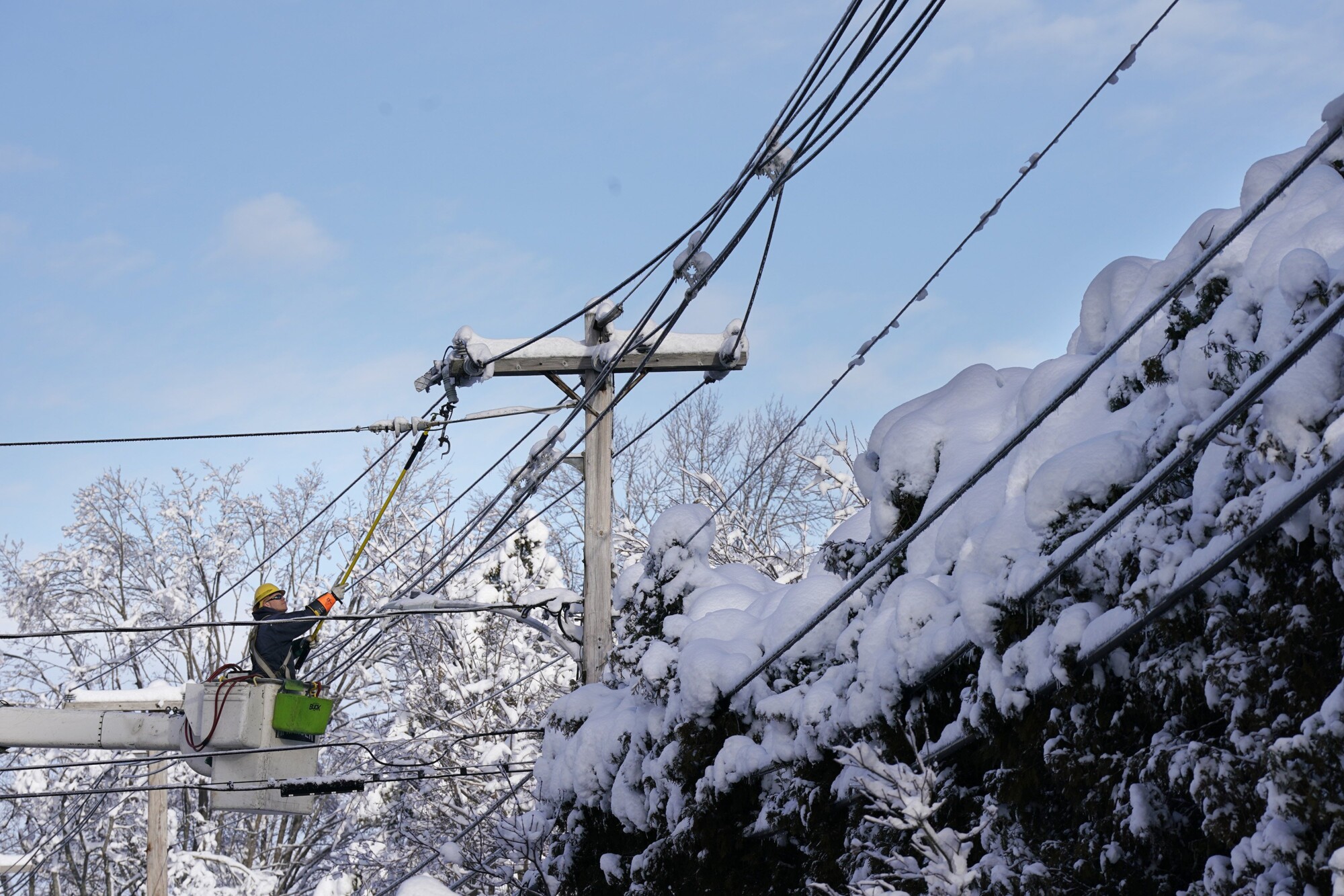 Brent Delnicki works on a line along Fletcher Street in Kennebunk on Tuesday. Delnicki is a lineman with Eastern Maine Electric in Calais and came to Kennebunk to assist the Kennebunk Light & Power District restore power. A damaged feed line to a KLPD substation caused widespread outages in the town. Gregory Rec/Staff Photographer