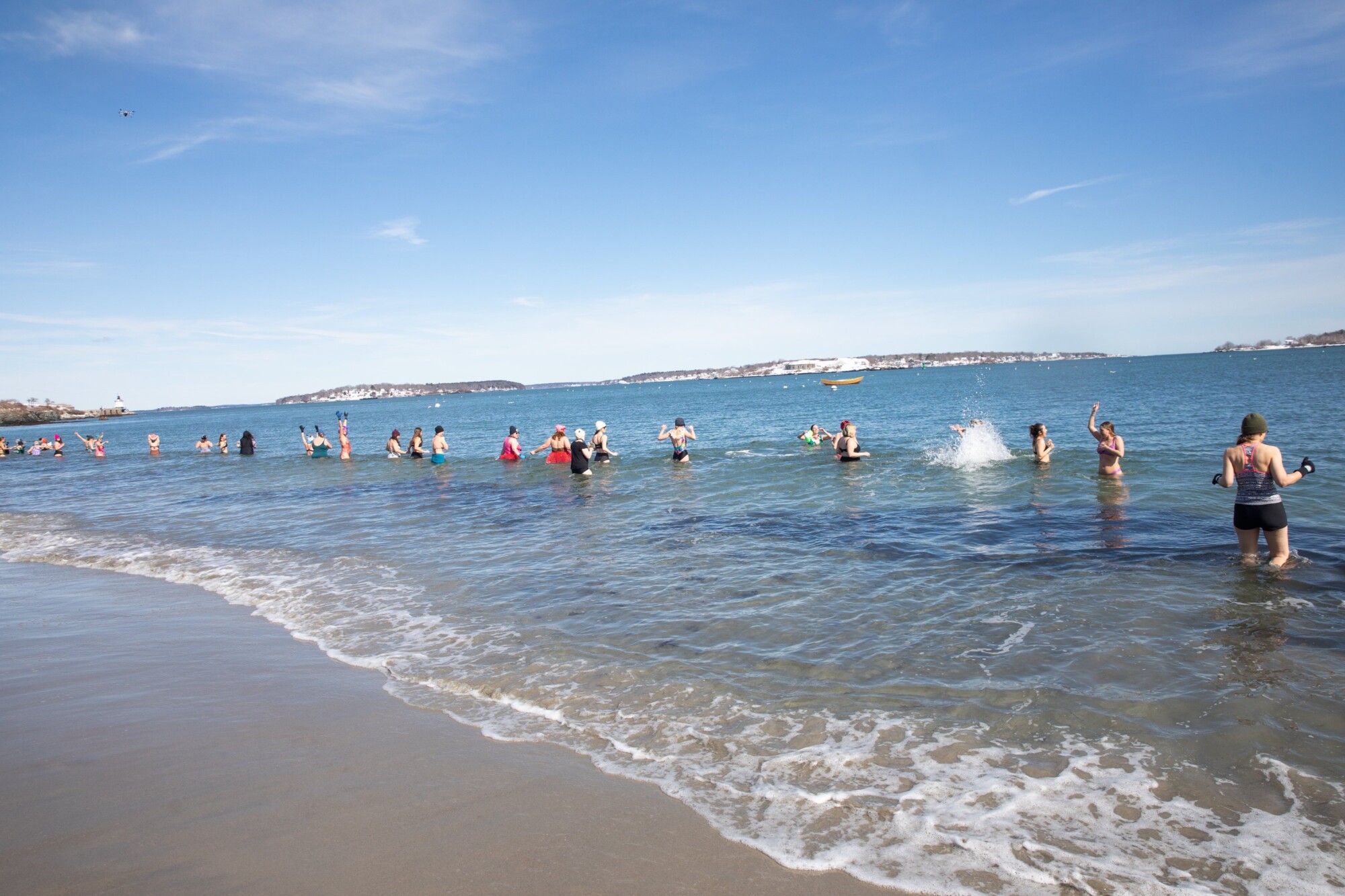 People gathered at Willard Beach for a cold plunge to celebrate International Women’s Day on Sunday.