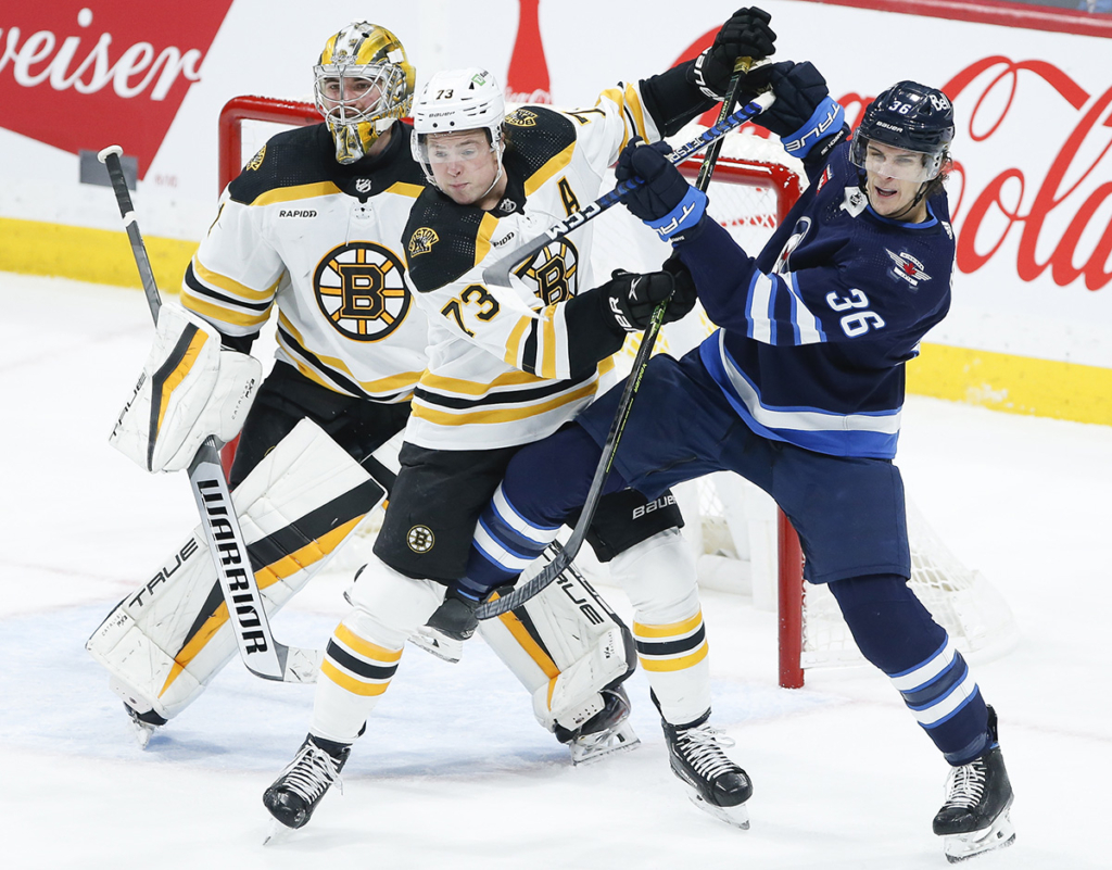 Boston defenseman Charlie McAvoy, center, attempts to clear Winnipeg’s Morgan Barron, right, from in front of goaltender Jeremy Swayman during Thursday’s game in Winnipeg, Manitoba. John Woods/The Canadian Press via AP