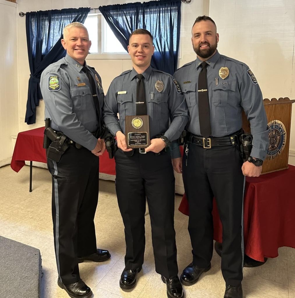 Officer Zach Huber (center) displays his award for outstanding public service with Brunswick police Chief Scott Stewart (left) and Lieutenant Jerod Verrill (right). Courtesy of Brunswick Police Department