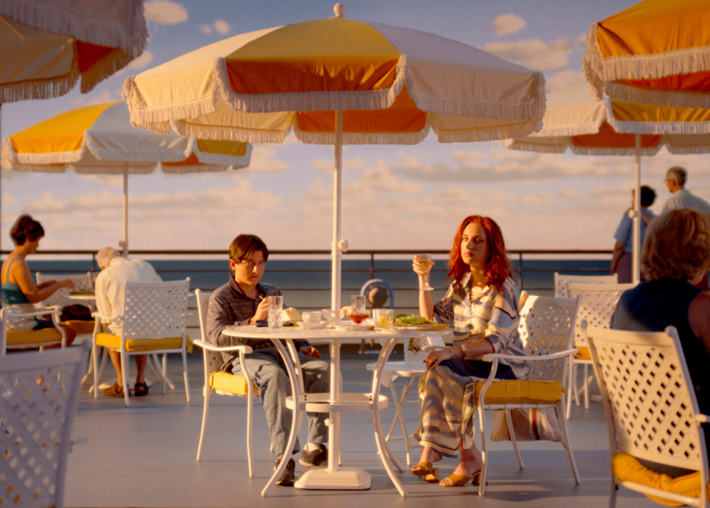 Armen Nahapetian, left, as the teenage Beau Wasserman, and Zoe Lister-Jones in “Beau Is Afraid.” A24