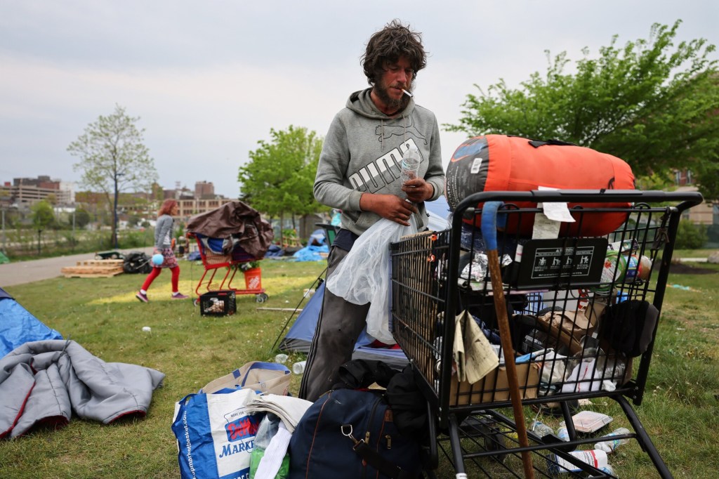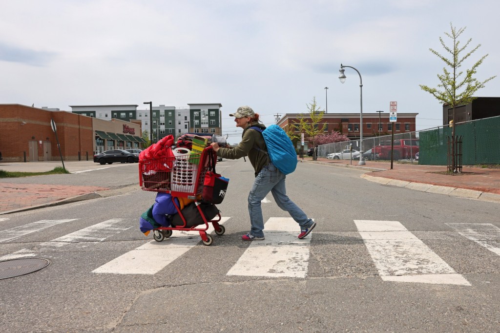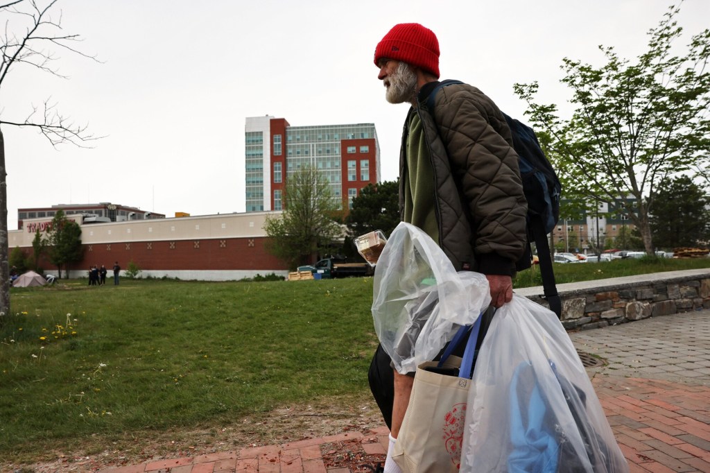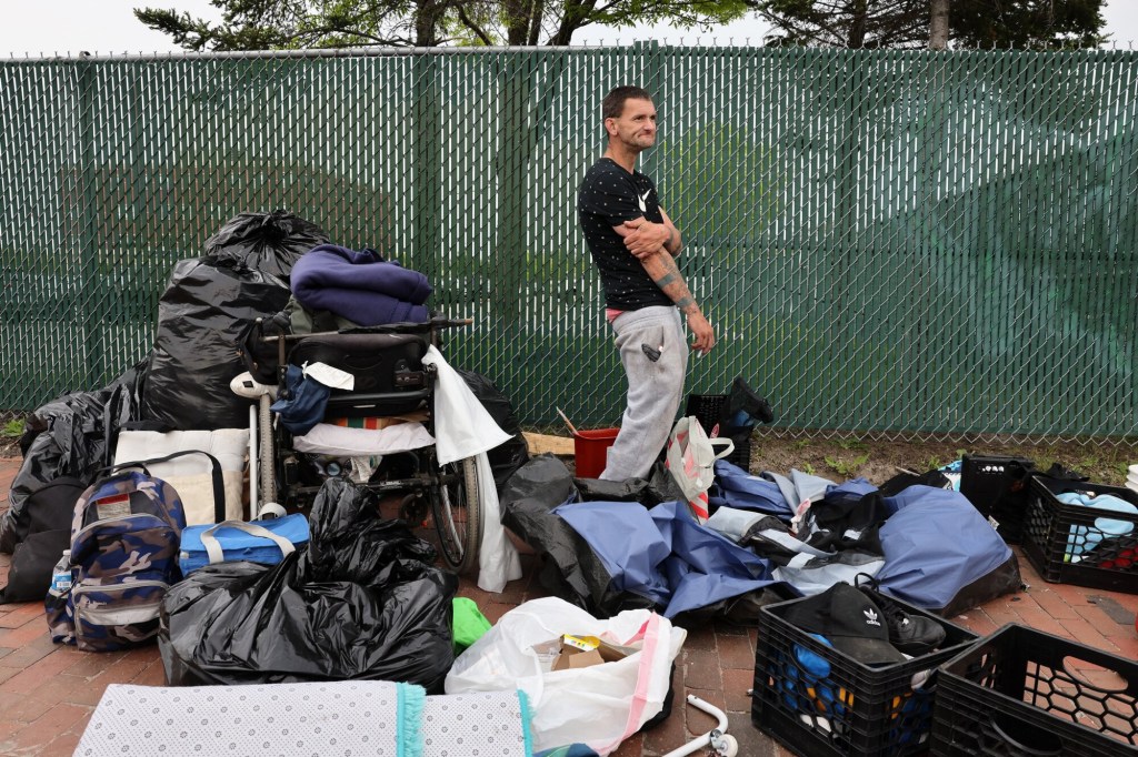 Andrew Flagg, 38, stands among his belongings on Chestnut Street after leaving a homeless encampment on the nearby Bayside Trail. Flagg said he wasn’t sure where he would go next. Ben McCanna/Staff Photographer