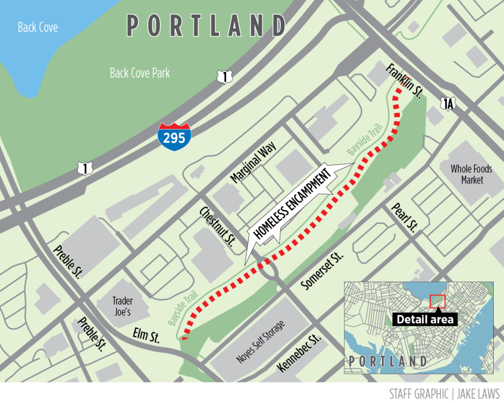 Another site that has attracted homeless campers in the past has been along the Fore River Parkway trail, but on Tuesday night there were no tents or campers. A grassy area near the Western Promenade Cemetery contained a couple of small, unoccupied tents on Tuesday evening, but there was no evidence of major encampments like the 80 or so tents that had been along Bayside Trail.