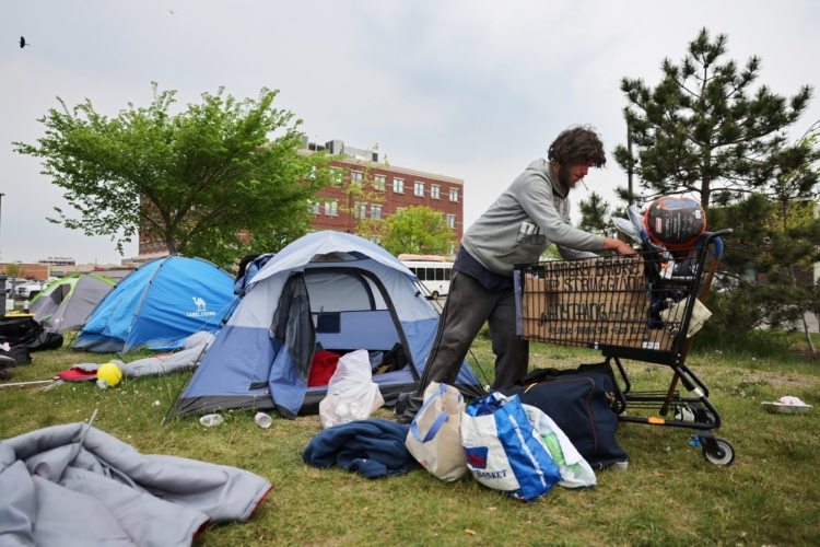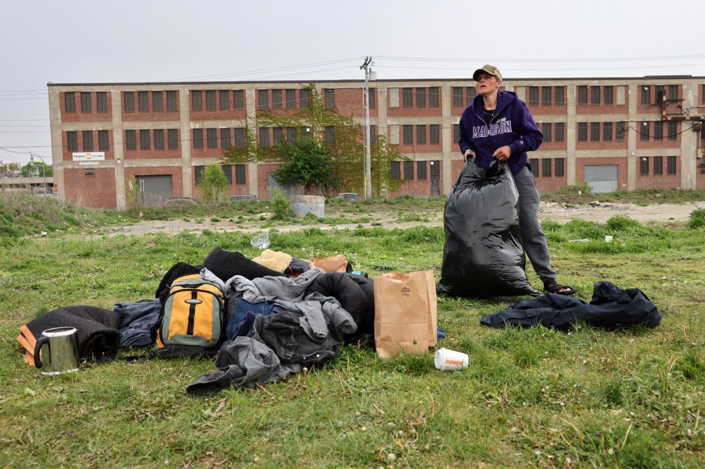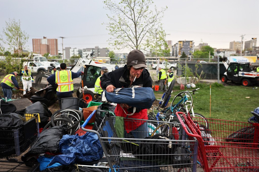 “I don’t know. I’ll probably lose all my (belongings) because I have nowhere to go,” said Andrew Flagg, who moved several garbage bags, a tent and a wheelchair to a street corner as the camp was cleared.