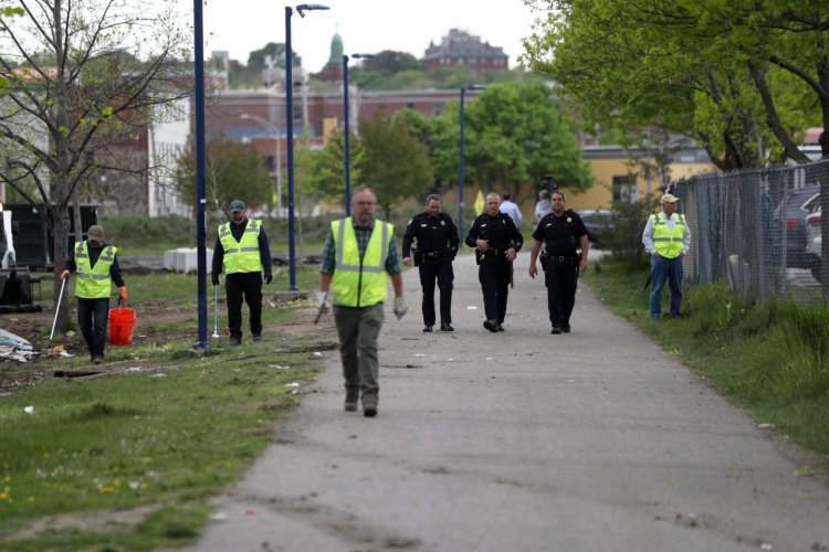 Portland police and city workers walk along the Bayside Trail after clearing out a homeless encampment on Tuesday morning. Ben McCanna/Staff Photographer