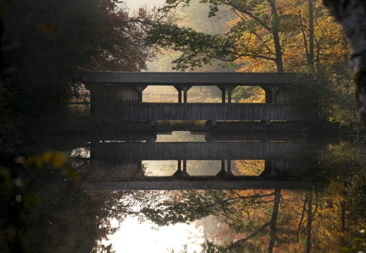 Mist, sun and fall foliage combine to make a colorful palette behind a covered bridge over Fernald Brook at the Rachel Carson National Wildlife Refuge in Kennebunk. Gregory Rec/Staff Photographer