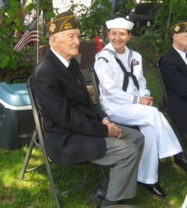 John Alden is pictured with his granddaughter, Sarah Flanders, at Memorial Day exercises in Gorham. Flanders served five years in the Navy. Alden is a Navy World War II veteran. Robert Lowell / American Journal