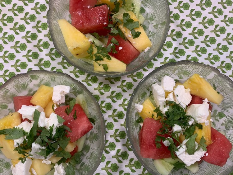 You’ll want to have the fruit and cucumber pre-chilled and be ready to gobble up the salad as soon as it’s assembled, as the zesty dressing draws the juice out of the fruit quickly and the salad will lose its fresh crunch. A sprinkle of Tajín, a chile-lime Mexican spice blend, is optional, but adds an extra touch of sultry “olé.” And if you’re dairy-free these days, the cheese can be omitted. Toasted pumpkin seeds are nice in this salad, or serve a bowl of tortilla chips on the side.