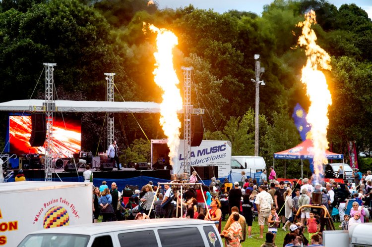 An Elvis impersonator performs as hot air balloon pilots fire up the burners at Simard-Payne Memorial Park during the 26th annual Great Falls Balloon Festival in 2019. Daryn Slover/Sun Journal