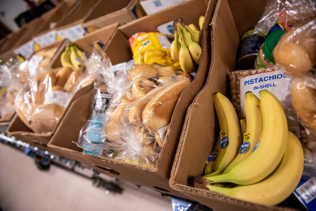 Boxes loaded with dry goods, bread, and bananas sit pre-loaded at the Harrison Food Bank. Andree Kehn/Sun Journal