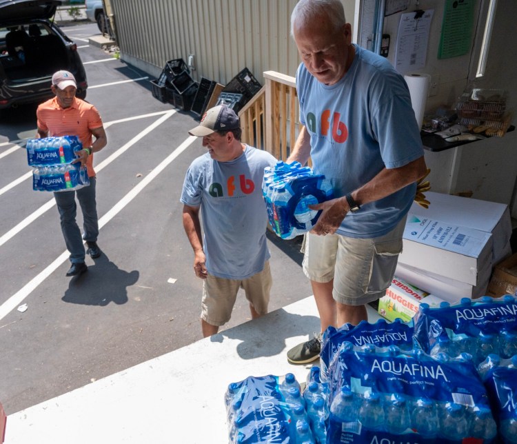 Kevin Russell left, delivers 36 cases of bottled water from the Maine State Employees Association food drive to Warehouse Manager Al Cloutier and Executive Director Bob Moore recently at the Augusta Food Bank in Augusta. Joe Phelan/Kennebec Journal