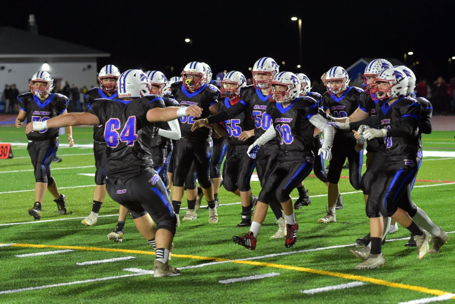 Members of the Mt. Ararat football team flock to the captains prior to a game against Cheverus last season in Topsham. Photo provided by Jason Eggleston