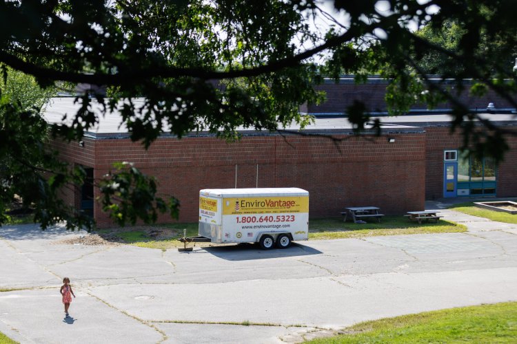 A trailer for one of the two mold remediation contractors hired by Portland Public Schools sits outside Gerald E. Talbot Community School on Friday. Brianna Soukup/Staff Photographer