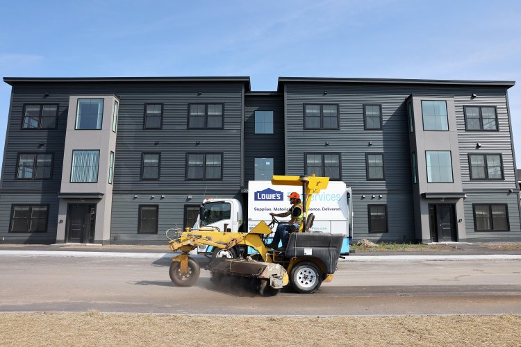 Justin Halladay, a worker for Risbara Bros. construction company, drives a street sweeper past under-construction homes on Frontrunner Way in The Downs, a vast housing development at the former site of Scarborough Downs. The project has far exceeded the municipally set performance standards, satisfying all categories nine years ahead of schedule, according to a report. Ben McCanna/Staff Photographer