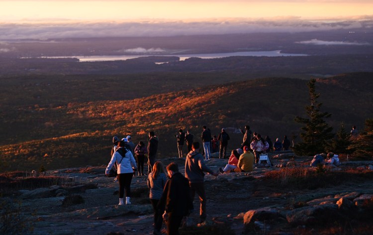A federal shutdown would likely close Acadia National Park, and fall foliage season is a peak time for visitors who tour the park and spend money in the region. Here, a crowd gathers atop Cadillac Mountain to watch the sun set at Acadia National Park in October 2022. Shawn Patrick Ouellette/Staff Photographer