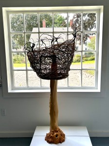 There are also various vessels constructed of bark that has been stitched together – a metaphor for mending and repair. This is a craft Cinnamon learned, at least in part, from Wabanaki practitioners. Yet, she points out on her website, “Unlike the exquisite perfection and complexity of local Indigenous artists, I use torn pieces of bark and am pleased to show visible mending, because the earth needs mending and humans need mending, and hiding our brokenness prevents healing.”