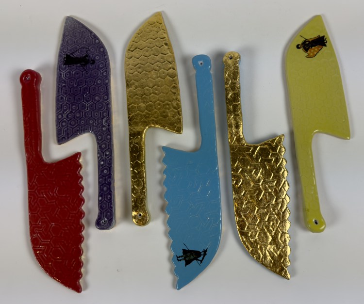 Sarah Khan, “Sliver or Slash (Smooth), Carve or Cleave (Jagged),” porcelain, glaze, decals, 24k gold, 11″ x 2.75″ x .50″ each. Photo courtesy of the artist