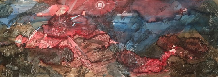 The two most astonishing pieces to me are diptychs portraying the elements: earth, wind, fire and water. They are long, scroll-like works from 2017, with “Earth and Air” depicted in one, “Fire and Water” in the other. Each is composed of two sheets of abutted paper onto which Burt lays a variety of watercolor washes and gouache in different colors. Then he begins complex drawings using India ink that limn visual manifestations of each element – swirling and funneling clouds, terrestrial landscapes, earth-scorching flames, churning waves. Often a cloud or a wave will morph at one end into a dragon or serpent, birds with hooked beaks, fish.