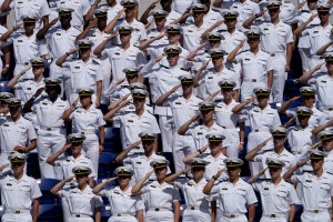 Midshipmen salute during the national anthem at the U.S. Naval Academy graduation and commissioning ceremony in Annapolis, Md., on May 26. The three largest service academies – the Naval Academy, West Point and the Air Force Academy – have underenrolled Black and Hispanic students relative to the total share of undergraduates at civilian four-year institutions for the past decade. Drew Angerer/Getty Images/TNS
