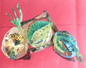 The exhibit’s overarching theme is exploration of various mediums and techniques, ranging from watercolor, acrylics and collage in the Speers Gallery, and weaving, needlework, and Japanese woodblock printing in a library foyer display case.