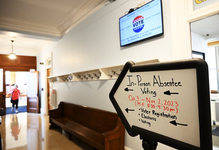 In-person absentee voting is in progress at Portland City Hall. Shawn Patrick Ouellette/Staff Photographer