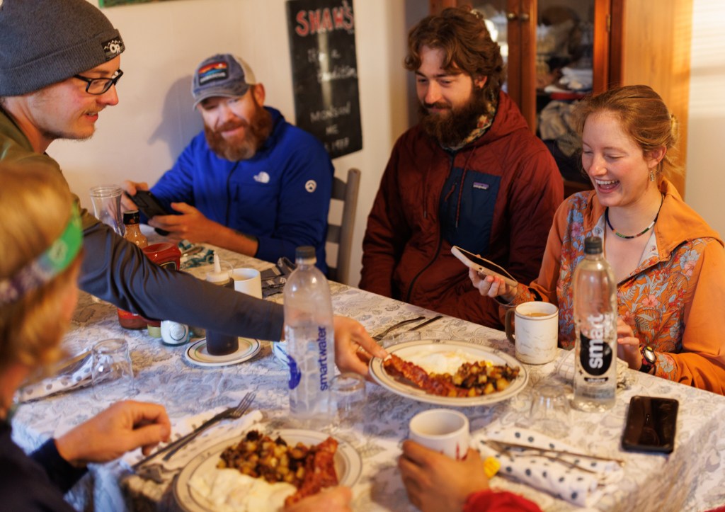 Hikers chat while they wait for their breakfast at Shaw’s Hiker Hostel. Brianna Soukup/Staff Photographer