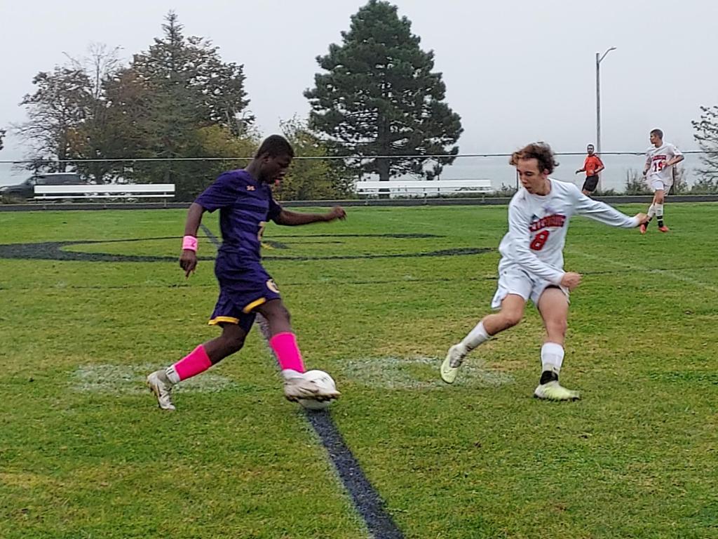 Cheverus freshman Ange-Michel Liwanga tries to get past a Scarborough defender during Friday’s 6-3 home loss. Michael Hoffer / The Forecaster