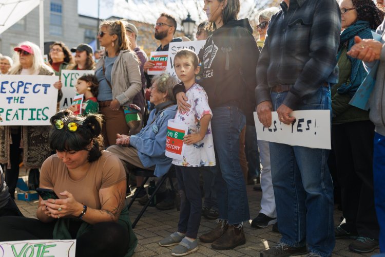 AUGUSTA — More than 250 people rallied at the State House on Monday to support passage of Question 6 on the fall ballot, which would restore the state’s original treaty obligations to Indigenous tribes to printed copies of the Maine Constitution.