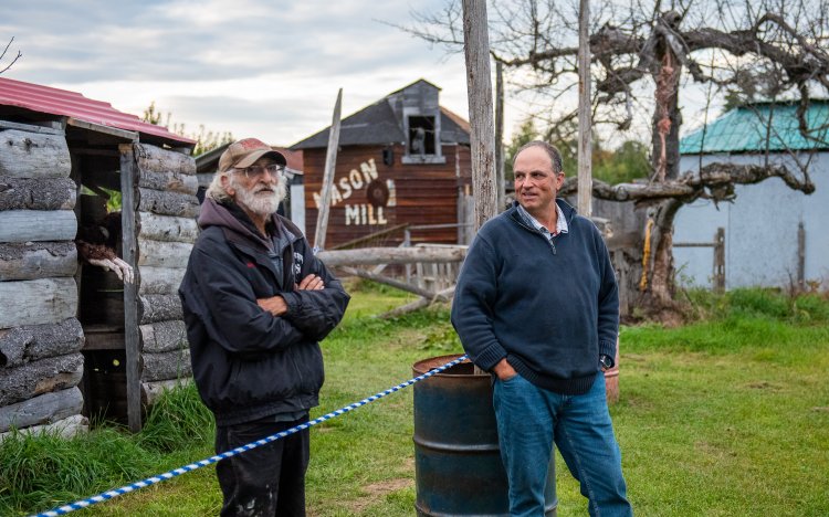 Jeff Strout, left, creator of Nightmare on the Ridge, talks Wednesday about the progress of changing the sawmill scene, background, with Peter Ricker at Wallingford’s Fruit House in Auburn. At issue was a scene depicting a scantily clad woman being sawed in half. Russ Dillingham/Sun Journal