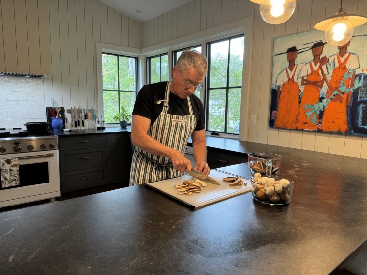 Jeff Onnen chops mushrooms for his (meaty but meatless) Mushroom ragu. Photo by Linda Onnen