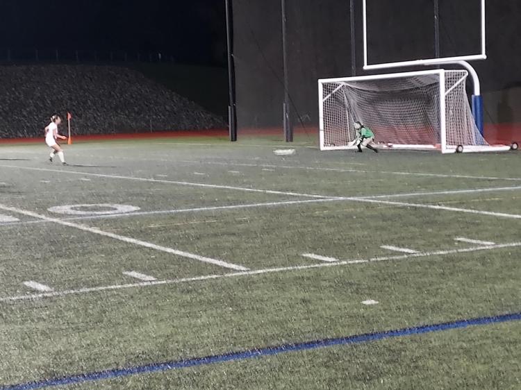 Yarmouth goalkeeper Regan Sullivan denies a penalty kick from Freeport’s Silvi Strong during the Clippers’ 2-0 victory last week. Michael Hoffer / The Forecaster.