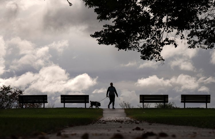 Silhouetted against a cloudy sky, Diane Gardner walks Lily, her English springer spaniel, through Fort Sumner Park in Portland on Monday. Gregory Rec/Staff Photographer