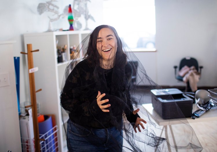 Monica Davis, a local artist and co-founder of Hydra Art Collective, plays around with tulle fabric at a “yART” sale at Engine. Derek Davis/Staff Photographer