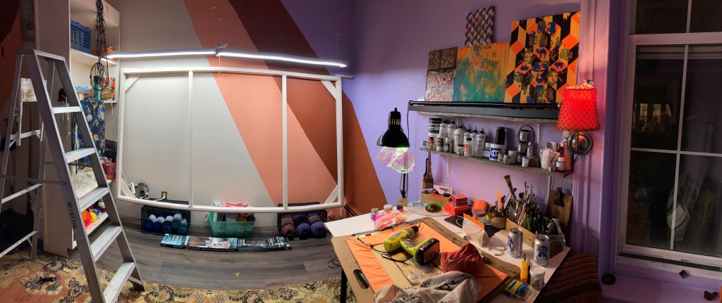 McIntire, who was a tenant at Engine for only a few months, has a background in printmaking and used the studio to explore a new interest in fiber arts and carpet making. They live less than a half mile from the studio and found greater focus in a dedicated workspace away from home. But McIntire is back to working in their basement because other options for studio space are significantly more expensive than the $150 per month they paid at Engine.