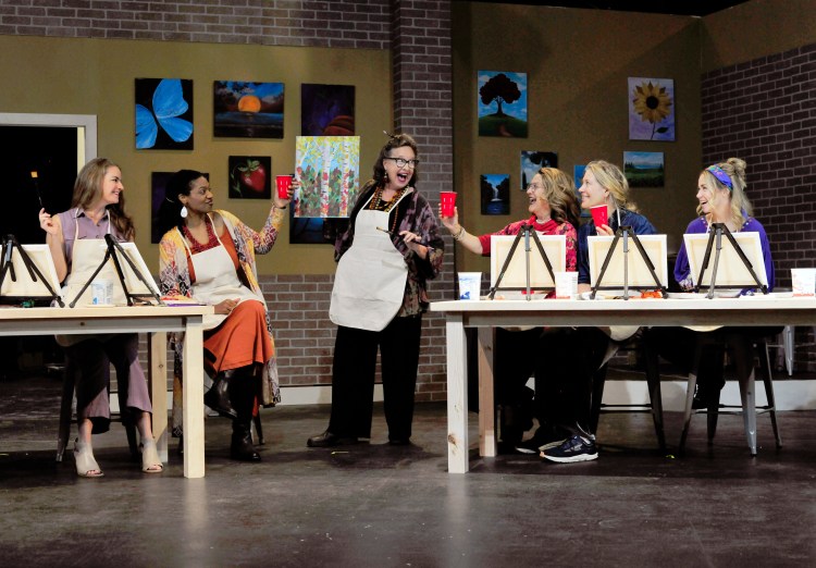 The occasion of the play is a gathering, part bridal shower, at an establishment that encourages “Creativity with a Cocktail.” Each participant is provided with a drink, a blank canvas, brushes and paint and encouraged to express their amateur talents while a teacher gently guides them along.