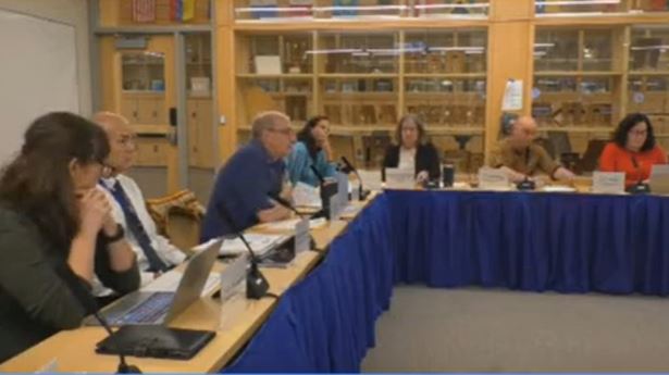 The Bath-area school board at its meeting Monday. In blue, leaning into the microphone, is board Chairperson Lou Ensel. RSU 1 / YouTube screenshot