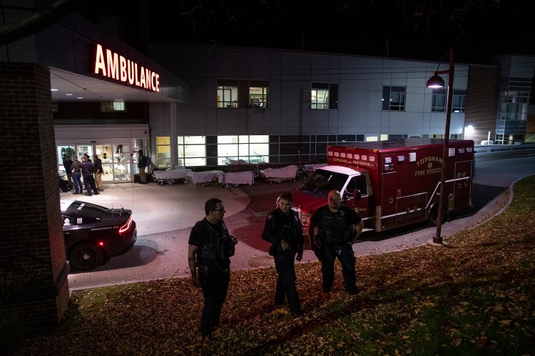 Officers guard the entrance to the emergency department at Central Maine Medical Center in Lewiston after a gunman opened fire on a restaurant and bowling alley Wednesday night. Derek Davis/Staff Photographer